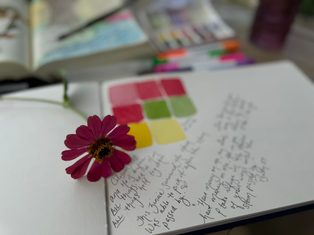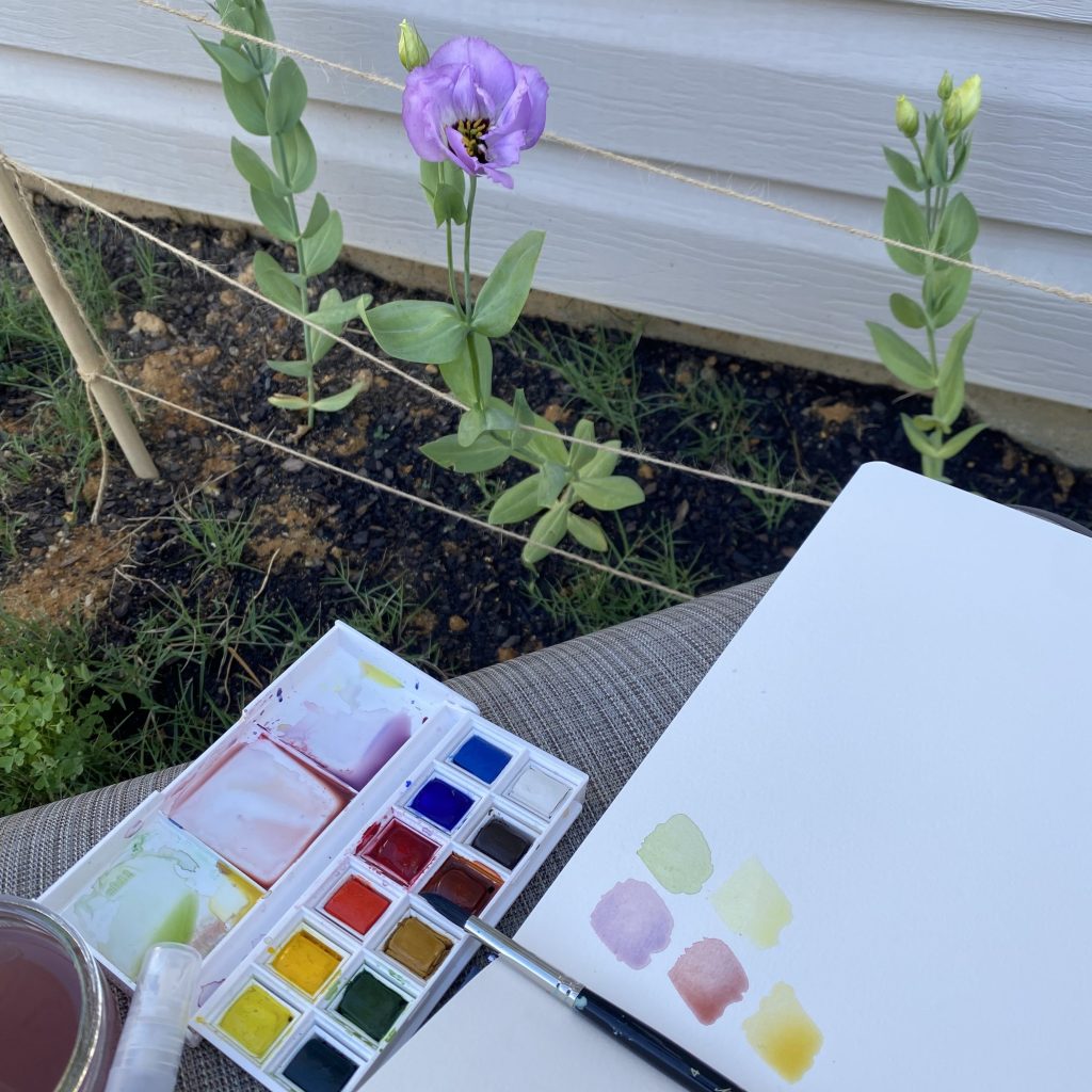 I found my watercolor journal on sale at hobby lobby. I use Winsor & Newton Cotman sketcher’s pocket set 13 PC that comes with an adorable tiny paint brush. I prefer various brushes found at hobby lobby.